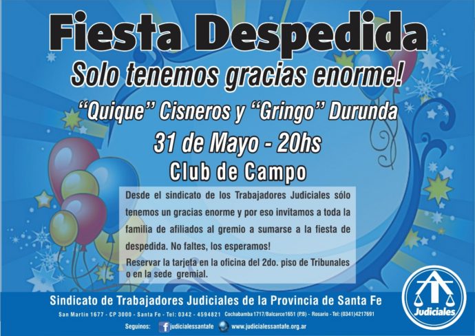 Por ello invitamos a toda la familia de afiliados al gremio a sumarse a la fiesta de despedida el viernes 31 de mayo desde las 20:00 hs. Festejaremos en el Club de Campo de Santa Fe. Reservar la tarjeta en la oficina del 2do. piso de Tribunales o en la Sede Gremial.
