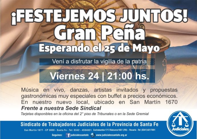 Los Trabajadores Judiciales celebraremos el aniversario del Día de la Patria con la Gran Peña Esperando el 25 de Mayo, el próximo el viernes 24, a partir de las 21:00 horas, en el nuevo local de San Martín 1670, frente a nuestra Sede Gremial.