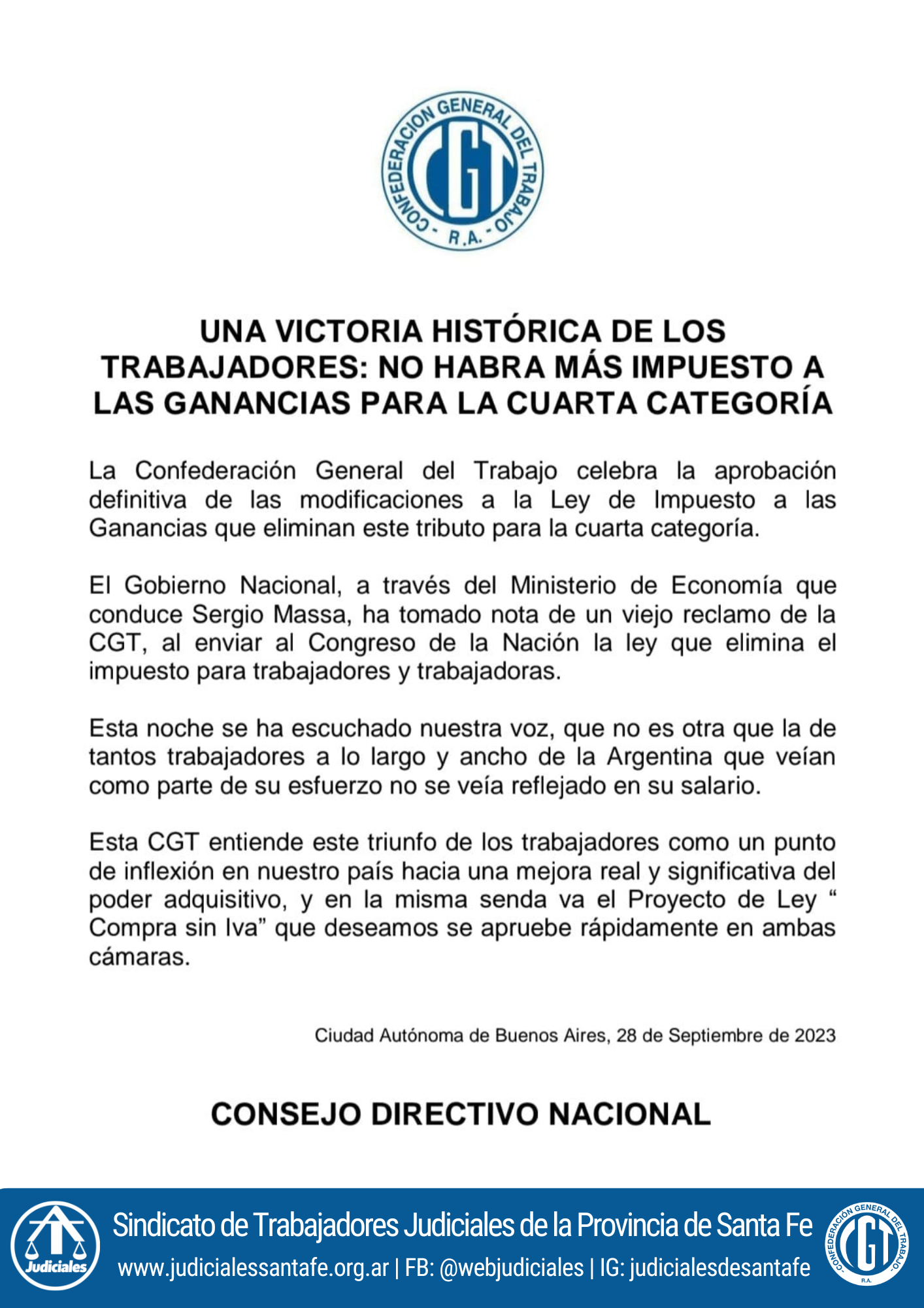 Esta CGT entiende este triunfo de los trabajadores como un punto de inflexión en nuestro país hacia una mejora real y significativa del poder adquisitivo, y en la misma senda va el Proyecto de Ley » Compra sin lva» que deseamos se apruebe rápidamente en ambas cámaras.
